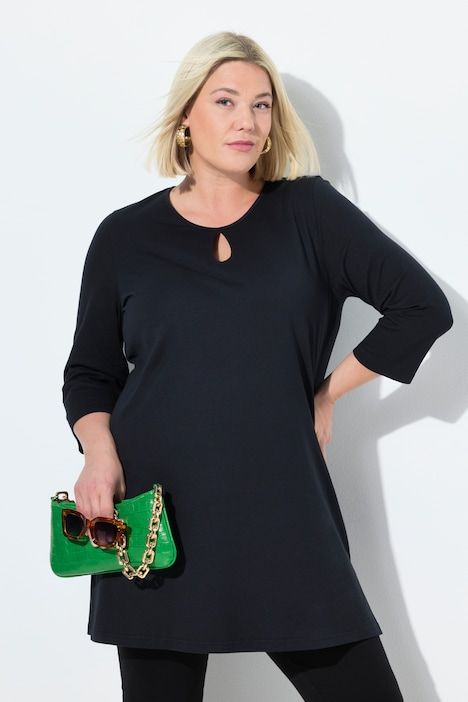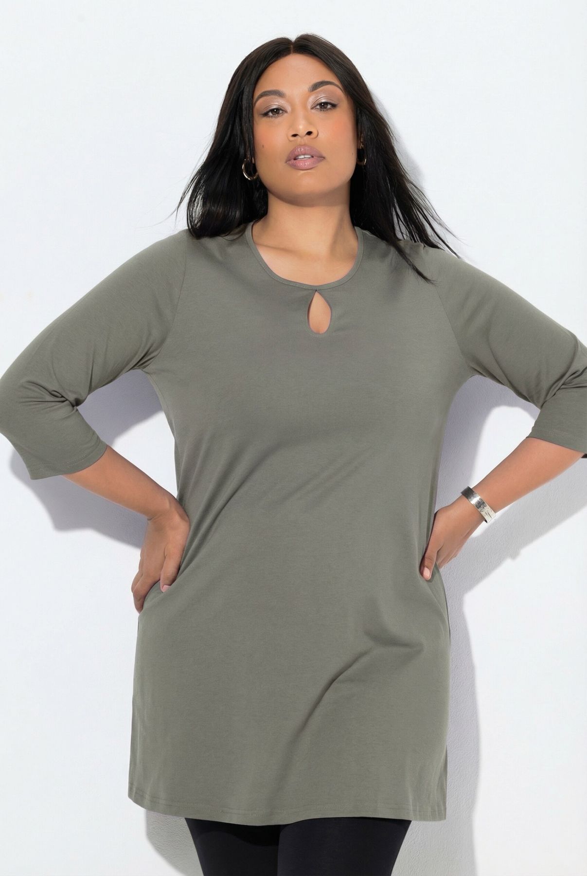 Décolleté rond, Petite fente en « trou de serrure » sous le décolleté, Coupe évasée, base ample et confortable, Manches 3/4, Pur coton, Long. selon taille env. 86 cm.