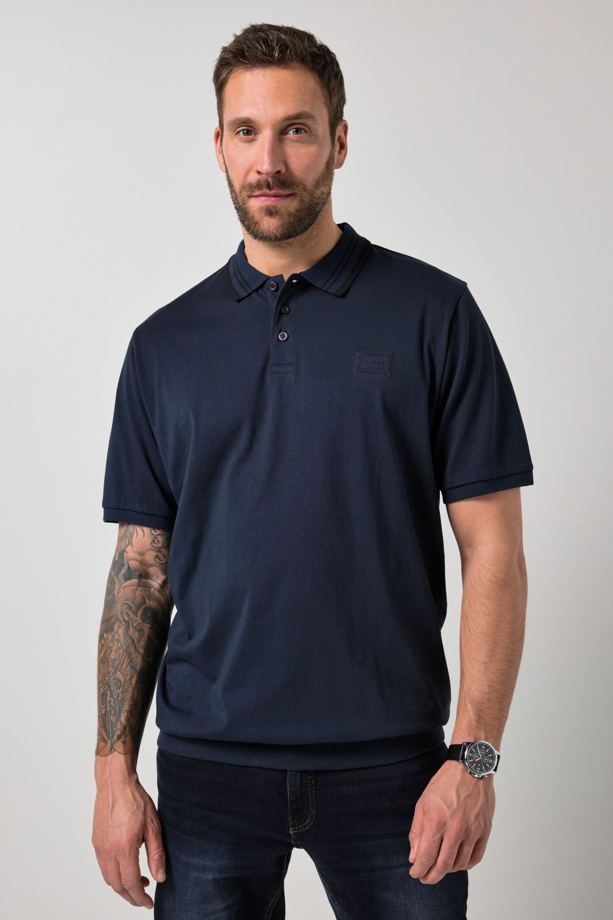 Coupe spéciale du XXL au 8 XL, Jersey doux et confortable, Coupe ventre confort - base élastique empêchant le vêtement de remonter, Col polo à rayures et flocage sur la poitrine, Manches courtes, Long. selon taille env. 78-85 cm.