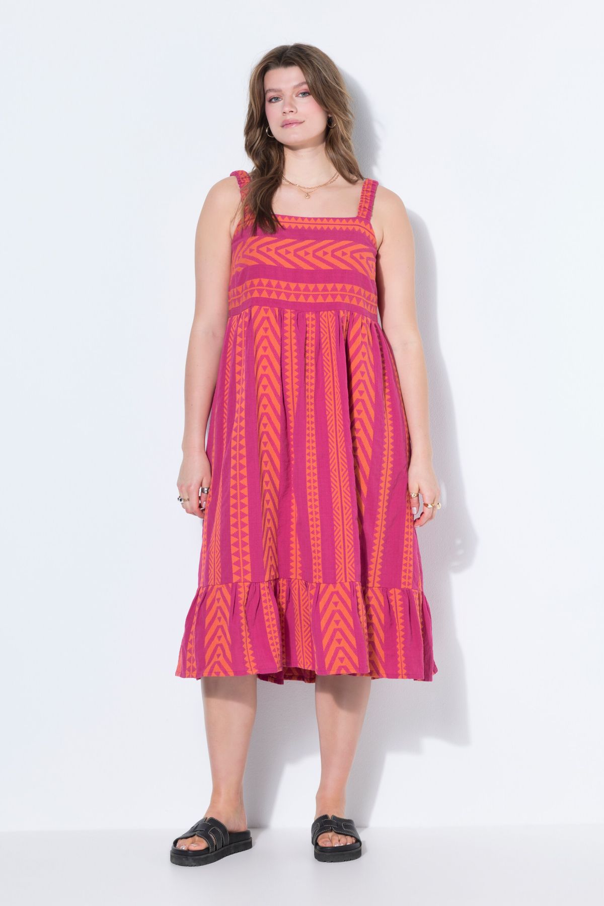 Ligne évasée sans manches, Motif jacquard tissé, Bretelles extensibles agréablement larges, Buste élastiqué au dos, Ourlet volanté, Long. env. 120 cm.