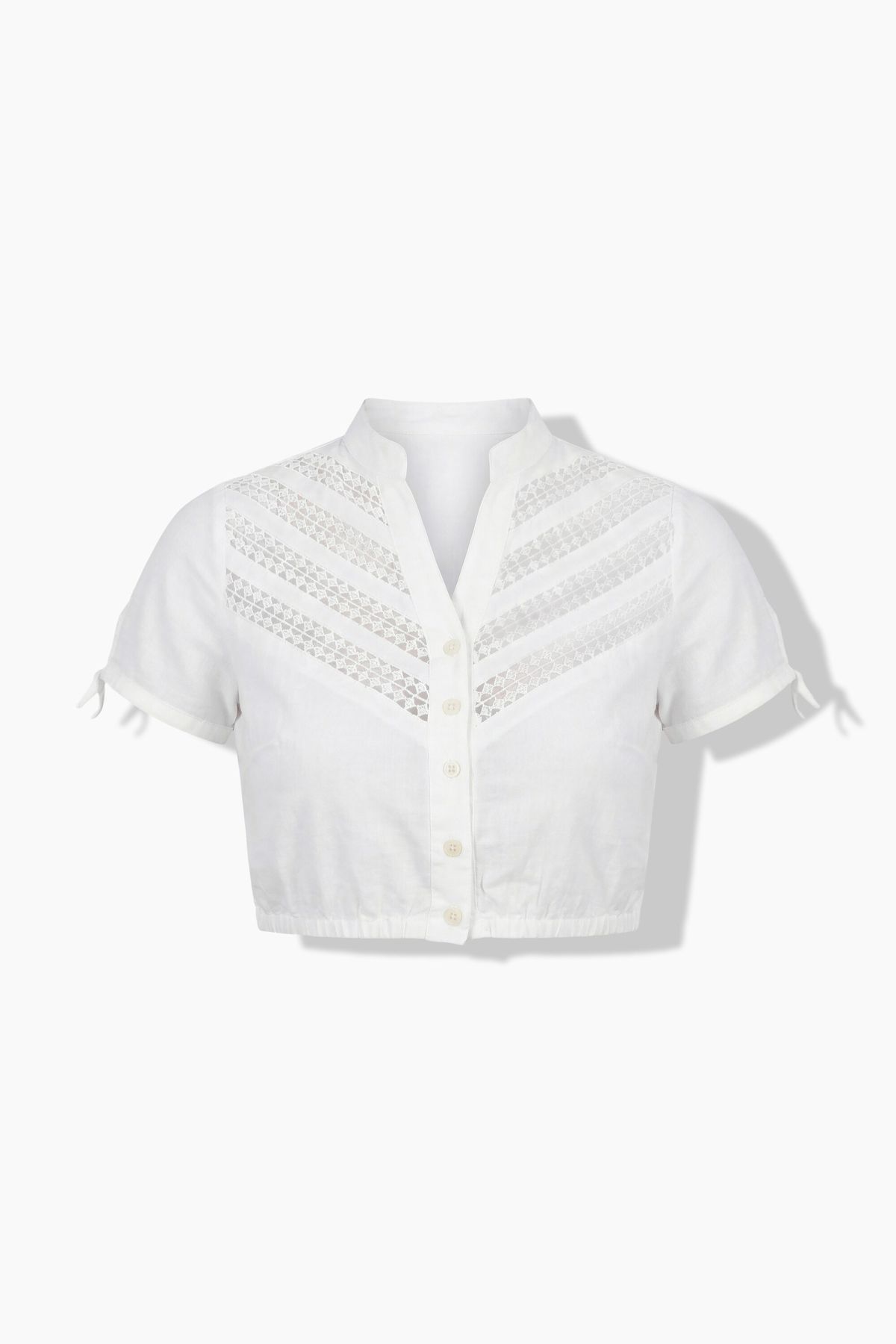 Dentelle sur le buste, Col montant avec décolleté en V, Patte de boutonnage avec boutons aspect corne, Manches courtes et amples, avec cordon à nouer aux extrémités, Base élastique, Long. selon taille env. 37-42 cm.