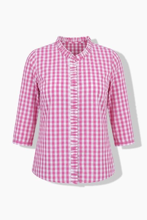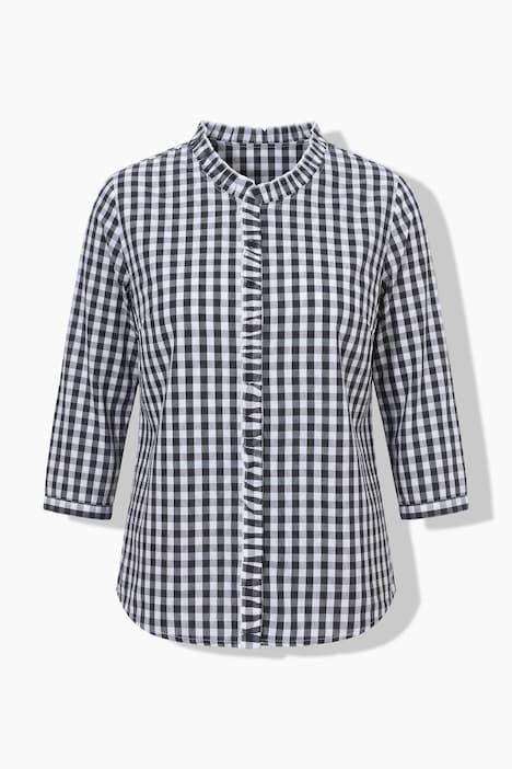 Chemisier à carreaux, col montant et ruchés, manches 3/4